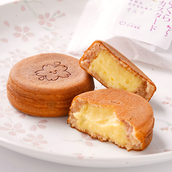 もっちりソフトな食感の優しい味わいに仕上げたカステラ生地に、桜の花びらと塩漬け桜葉のペーストを練り込み、なめらかな玉子風味のカスタードクリームを包んで焼き上げています。優しい味わいのカスタードクリームと、薄塩味のアクセントが嬉しい桜香るソフトなカステラ食感のマリアージュをお楽しみください。