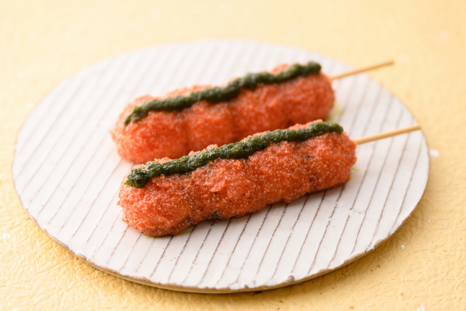 ロングセラーで定番人気の焼き明太だんご。その上にオリーブオイルを絡めたバジルを乗せています。少し辛みの利いた本真鱈の明太子とバジルの出会いは、まさに“イタリアンだんご”の味わいです。