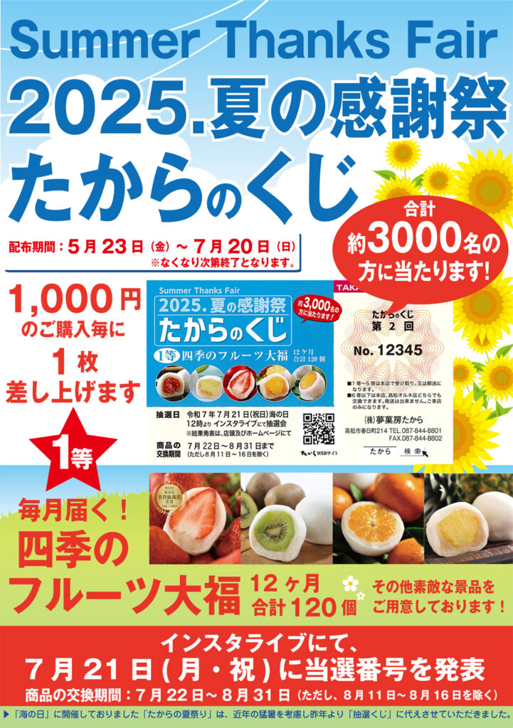 今年も、夏祭りの代わりに「夏の感謝祭り たからのくじ」を開催! 期間中、春日町本店またはJR高……