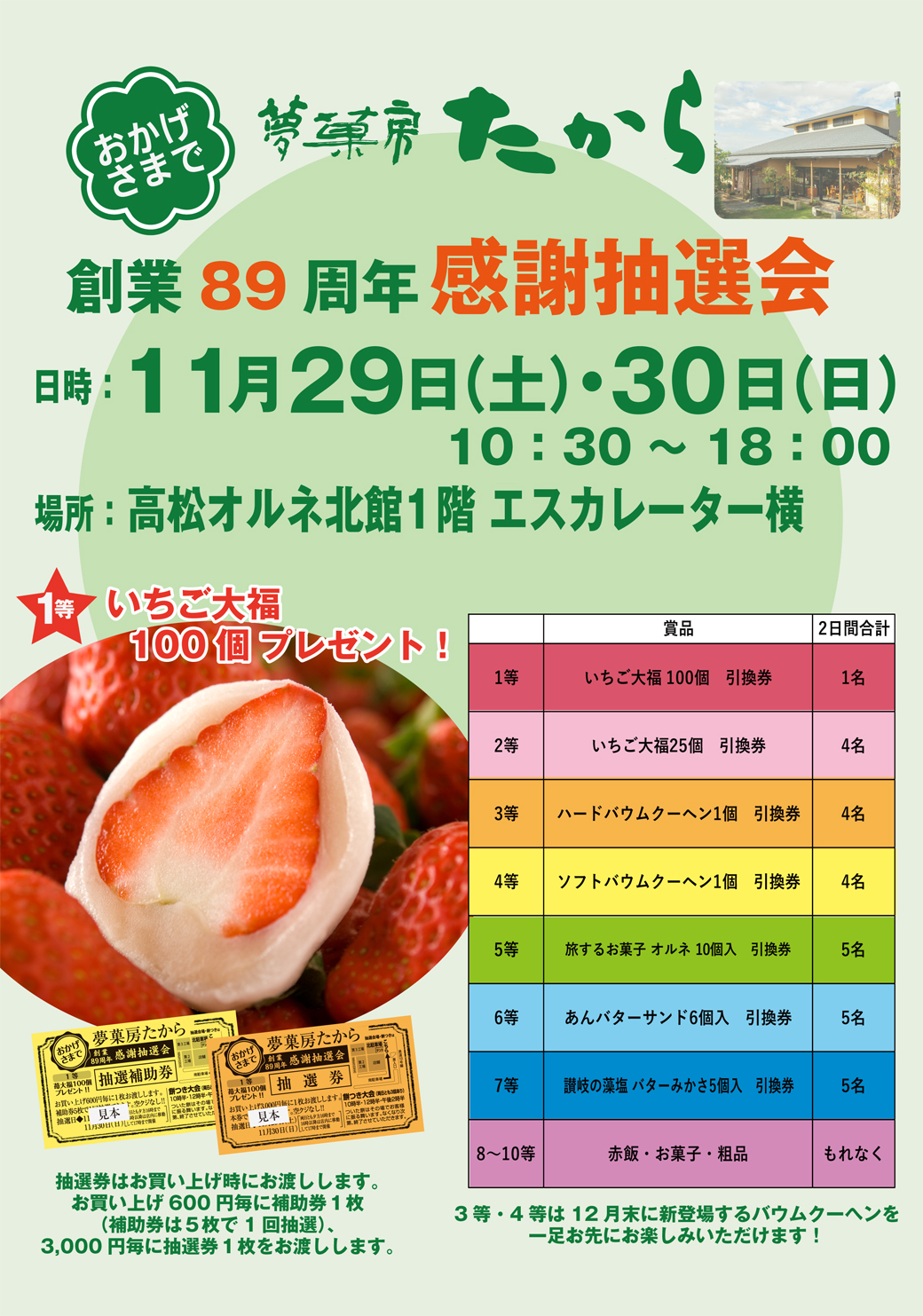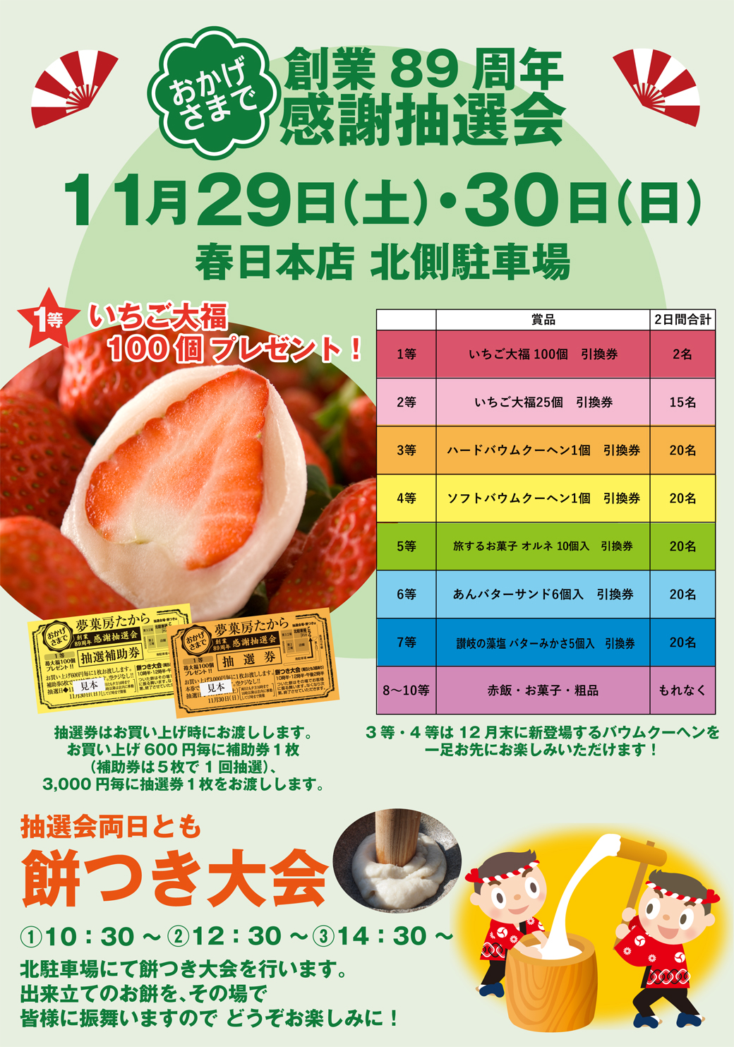 只今、春日町本店とJR高松オルネ店にて抽選券と抽選補助券を配布しております。 JR高松オルネ店でもささやかながら抽選会を行います。※餅つき大会は春日町本店のみです。 ぜひご来店くださいませ。 【春日町本店】 【JR高松オルネ店】