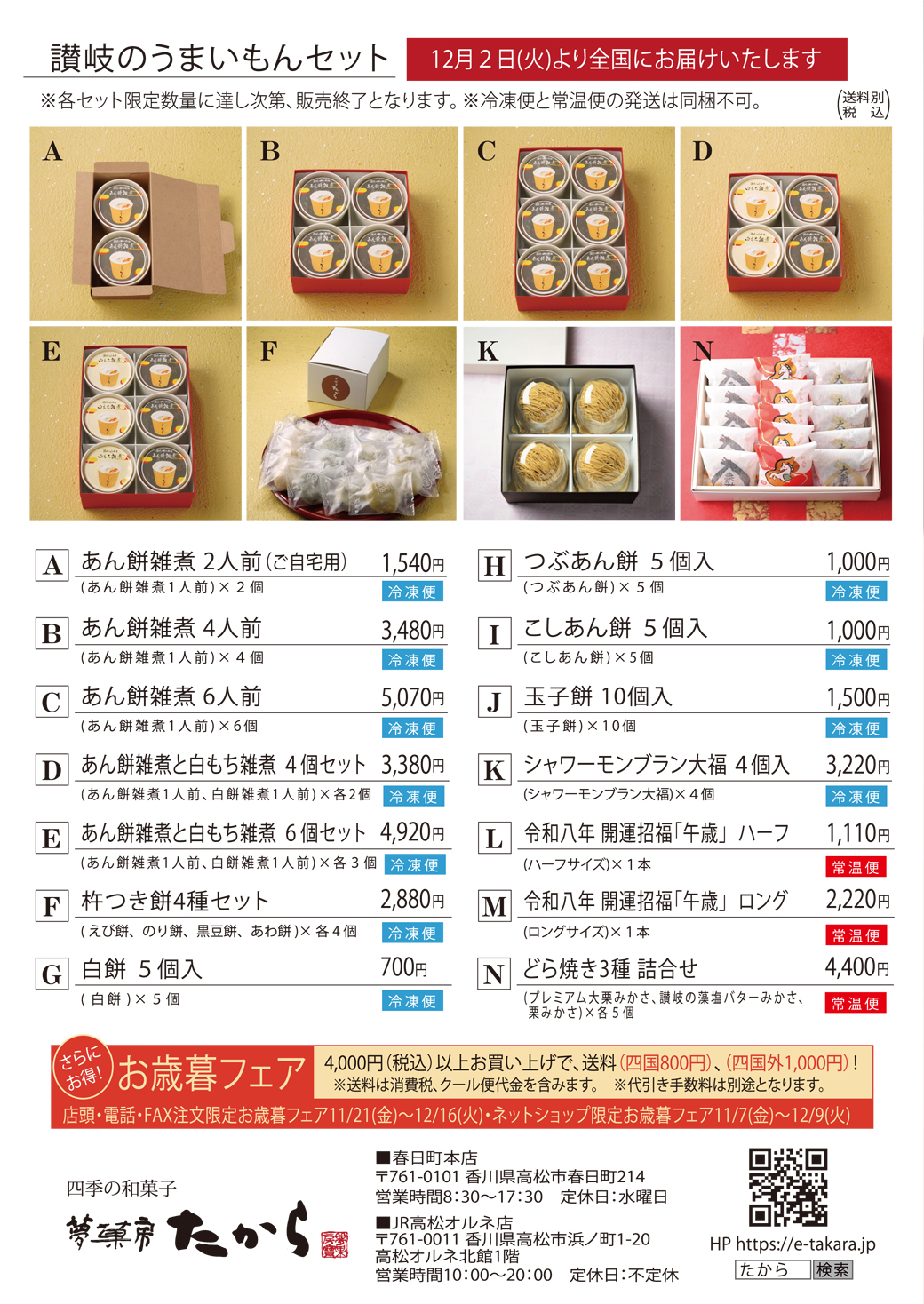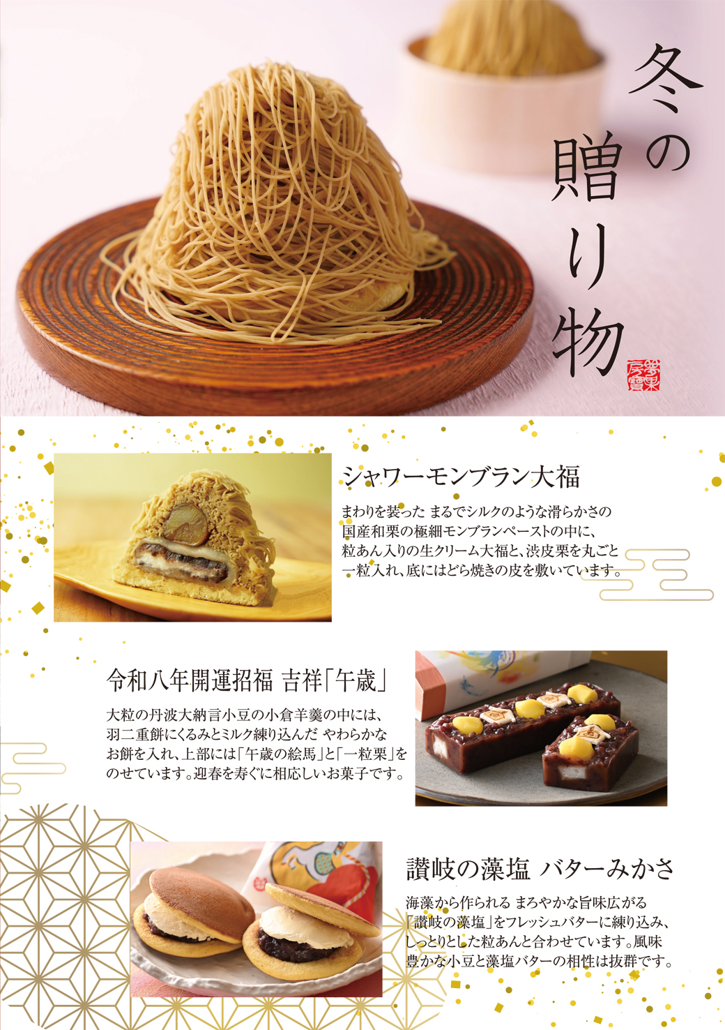 香川県高松市の夢菓房たから通販ショップでは、名物いちご大福をはじめ、季節のフルーツ大福とお取り寄せ和菓子を販売しています。いちごや栗など季節の食材を使用した白あん入りの大福や和菓子は、大切な方への贈り物にも最適です。