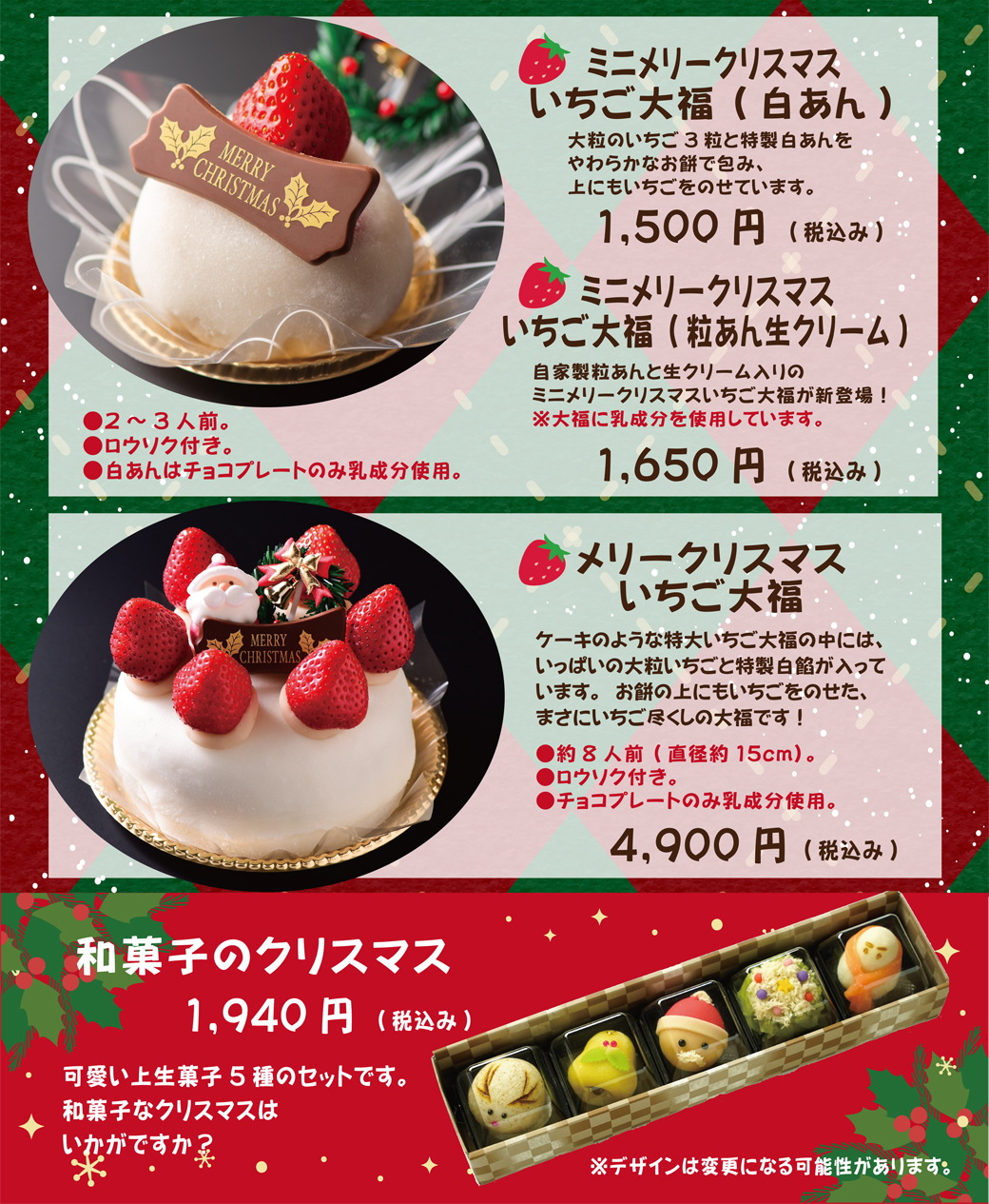「ミニメリークリスマスいちご大福」「メリークリスマスいちご大福」のご予約承っております。