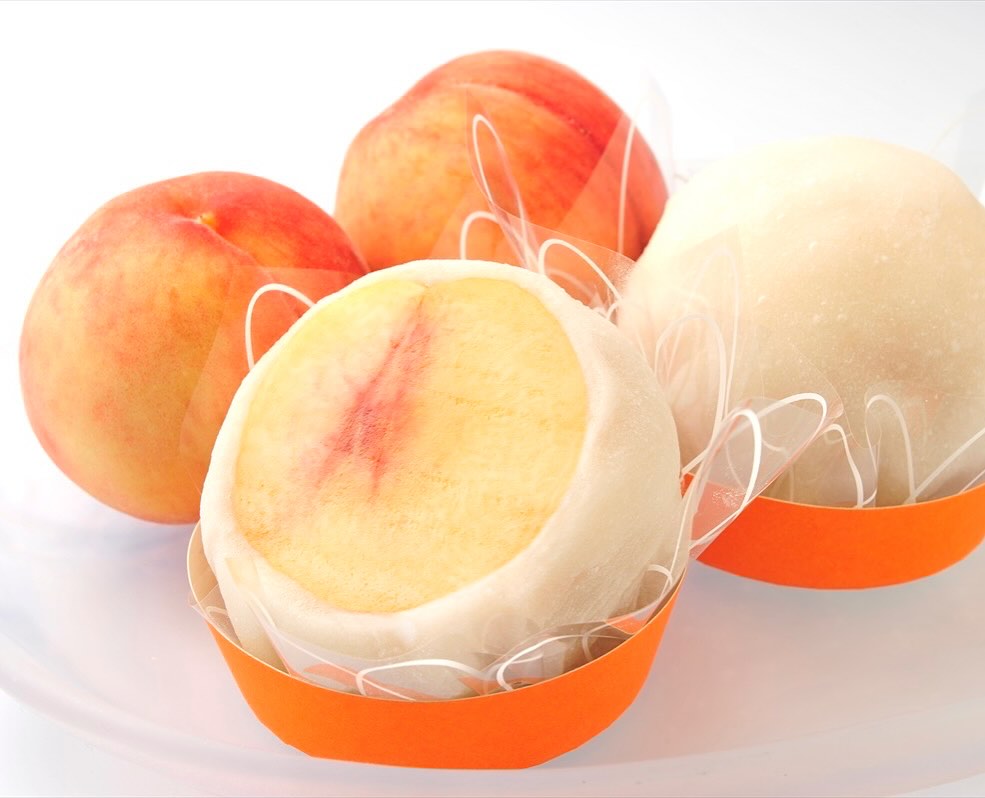 讃岐白桃の皮をむいてそのまま丸ごとの大福に仕上げた「白桃大福」は、食べた途端華やかな桃の香りとジューシーな果汁が溢れて口いっぱいに広がります。