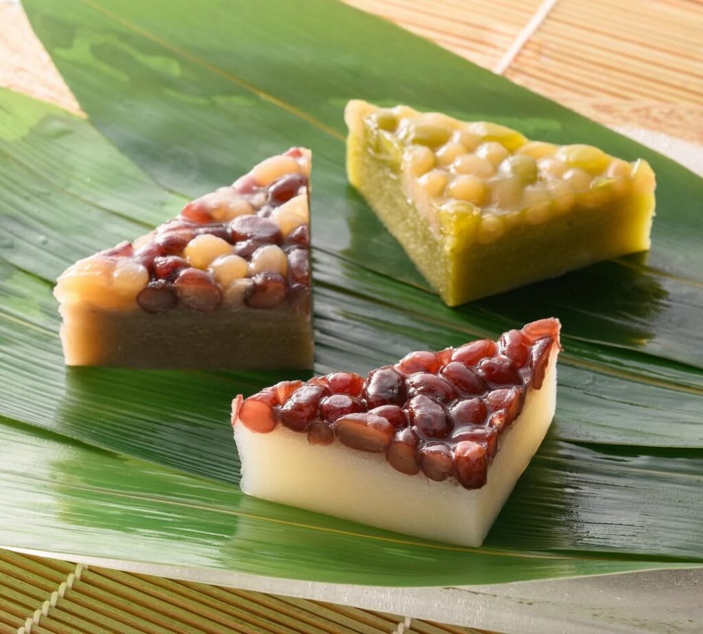 三角形の葛ういろうは氷室の氷を表し、上に乗せた小豆は、「厄除け」と「まめ」にと言う願いが込められ、半年間無事過ごせた事に感謝してこれから迎える暑い夏の無病息災を願っていただきます。