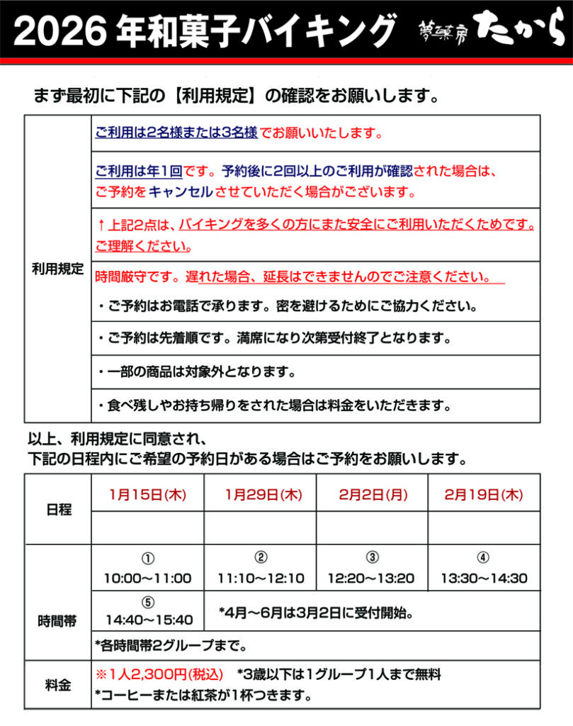 ★ご好評につき、1月・2月のバイキングは定員に達しました。ありがとうございました。