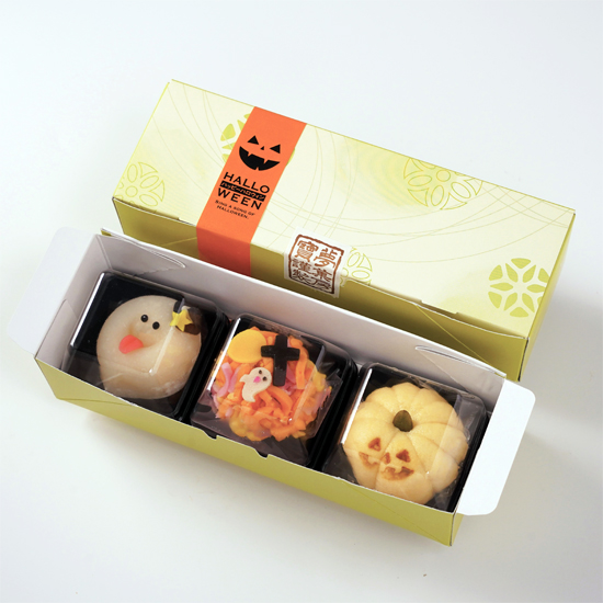 ■原材料:「ジャックオランタン」砂糖(国内製造)、白いんげん豆、かぼちゃ、上用粉、生クリーム、卵、山芋、かぼちゃの種、オリゴ糖、ブランデー/トレハロース、(一部に卵・乳成分・やまいもを含む)「ハロウィンナイト」砂糖(国内製造)、小豆、白いんげん豆、山芋、オリゴ糖、餅粉、寒天/トレハロース、着色料、(一部にやまいもを含む)「ゴースト」砂糖(国内製造)、白いんげん豆、上用粉、餅粉、卵黄、小麦澱粉、山芋/トレハロース、着色料、(一部に小麦・卵・やまいもを含む)